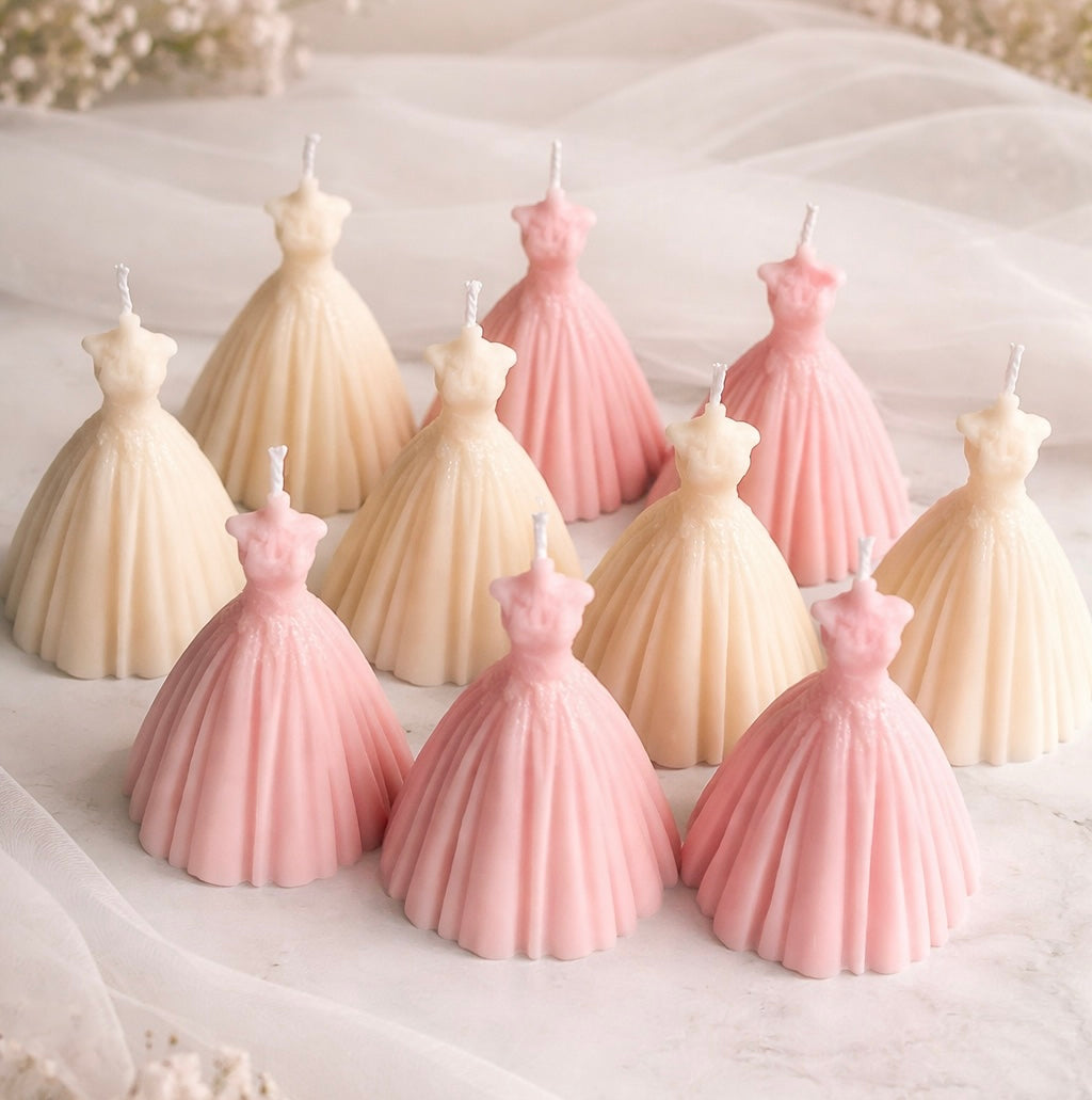 Inspired by timeless femininity and graceful silhouettes, Belle Gown is a handcrafted dress-shaped candle designed in soft blush and ivory tones. With its flowing pleated detail and elegant finish, this candle adds a romantic charm to any space. Perfect for gifting, bridal showers, birthdays, or refined décor, it’s a statement piece that’s as beautiful unlit as it is glowing.