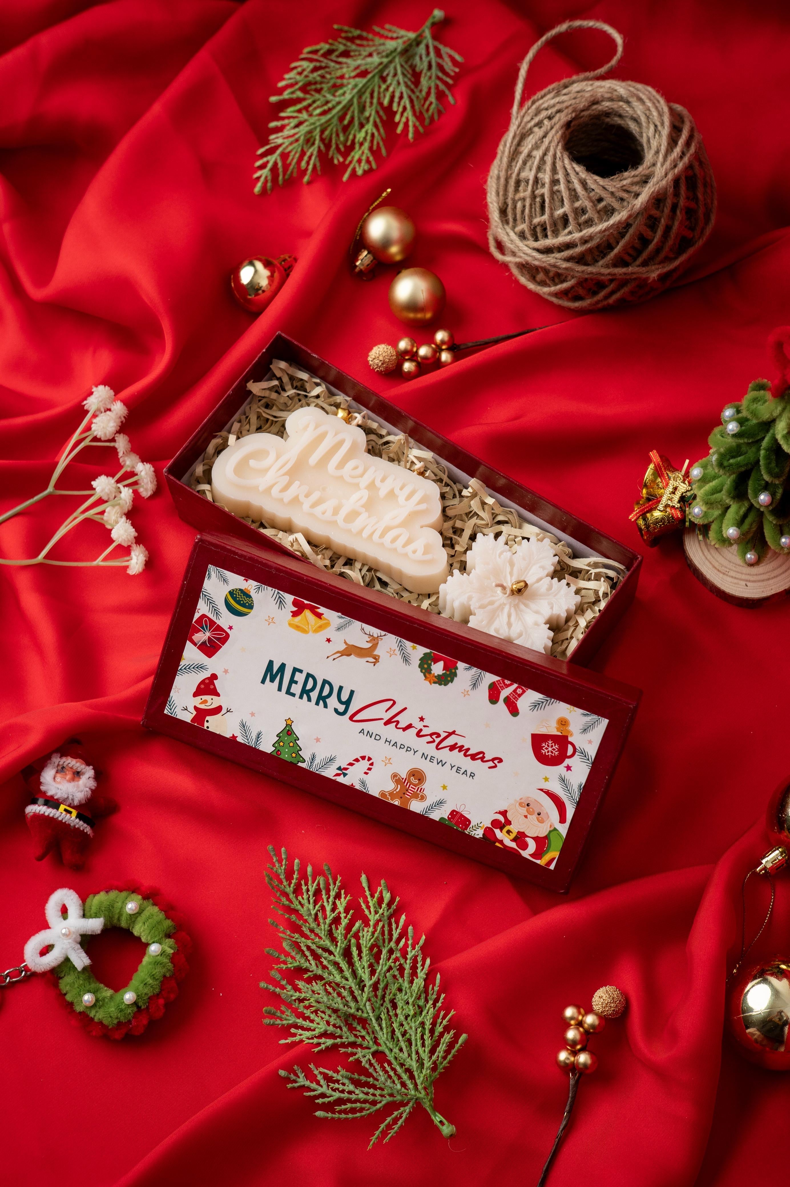Celebrate the season with timeless charm through our Classic Christmas Candle Box. This beautifully curated set features a handcrafted “Merry Christmas” statement candle paired with a delicate festive floral candle, thoughtfully arranged in premium shredded filling.