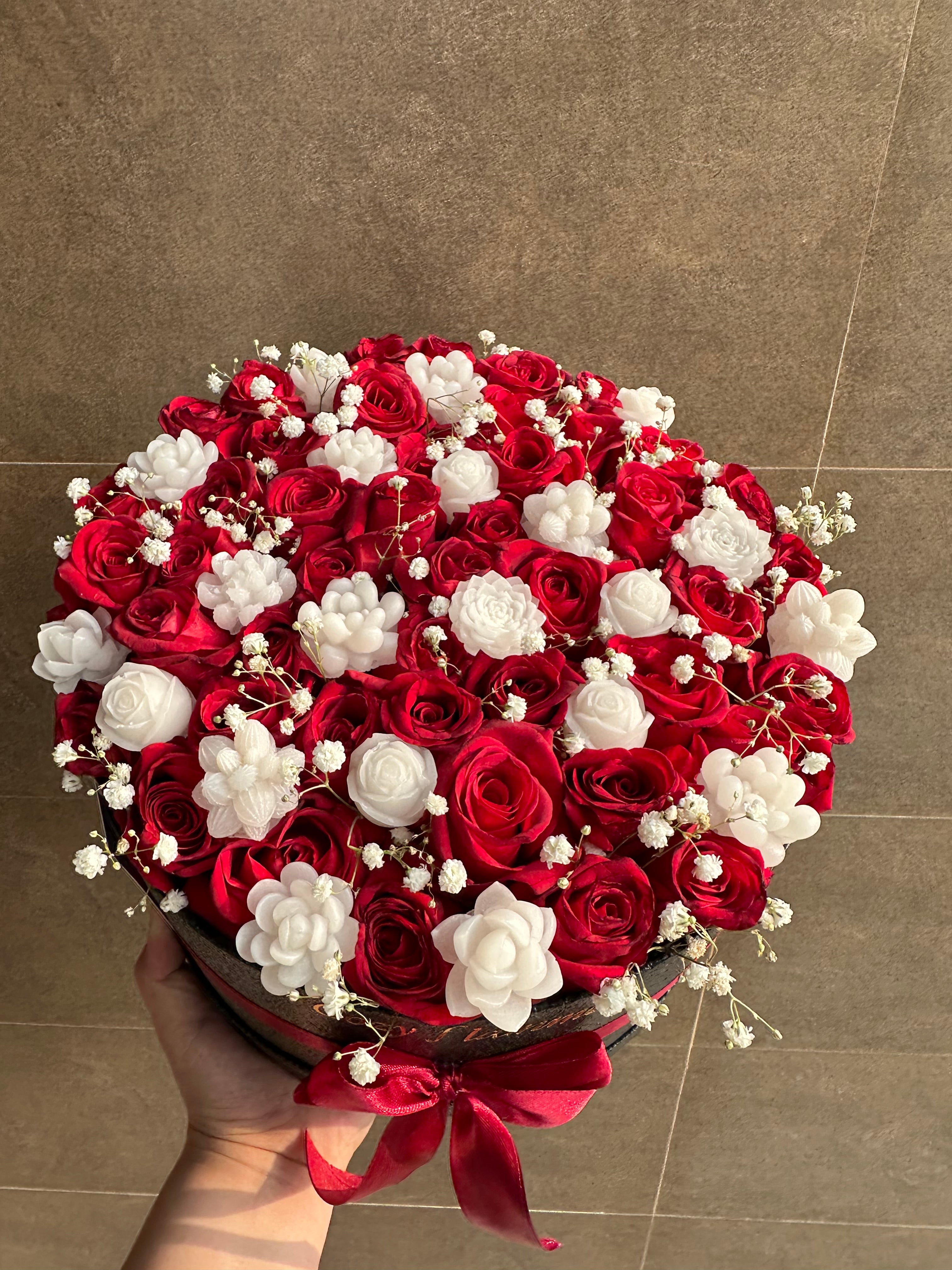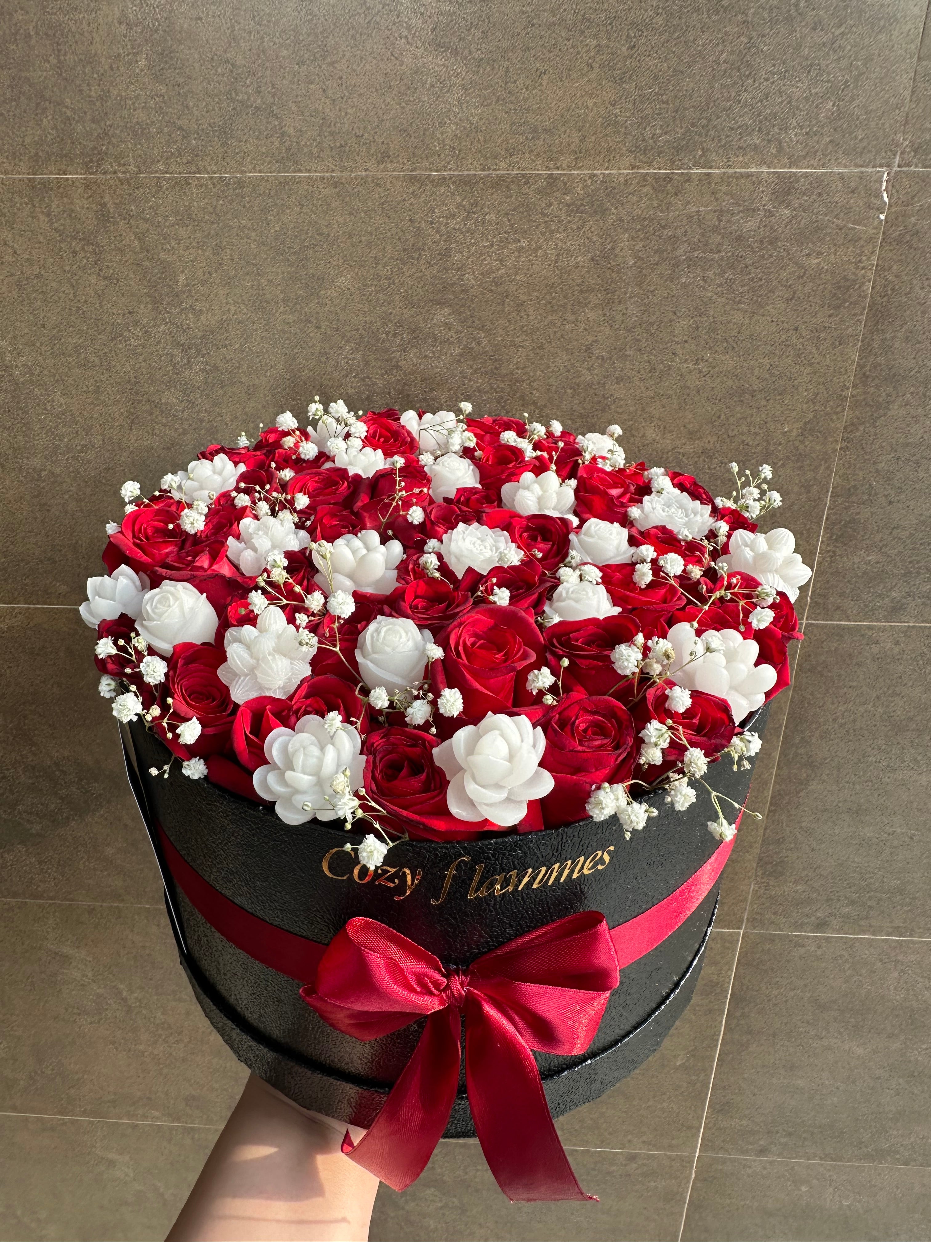 A timeless expression of love and passion, our Eternal Love Candle & Rose Bouquet blends the beauty of real fresh red roses with the elegance of handcrafted white floral candles. This luxurious arrangement is adorned with delicate baby breath and wrapped in a sophisticated black and red theme, making it the perfect gift for special occasions.