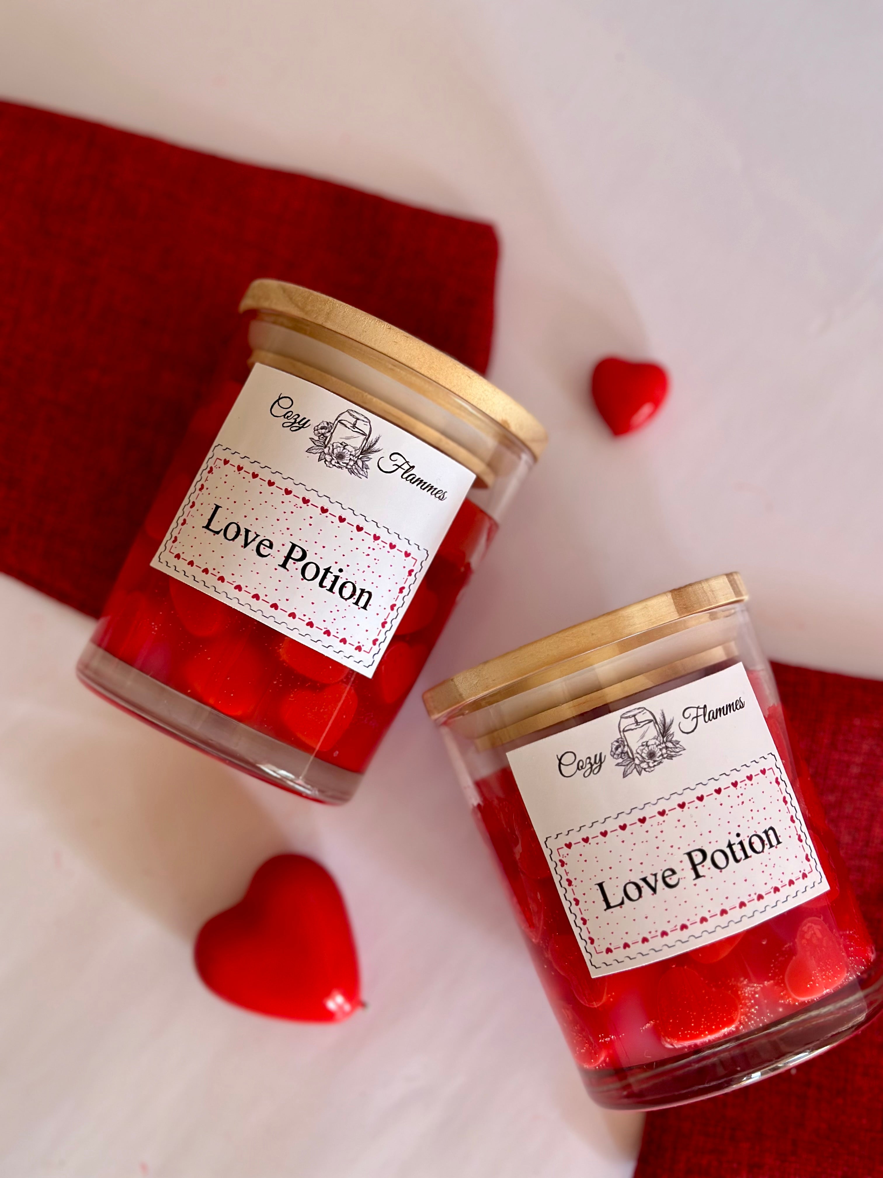 Ignite romance and warmth with our Love Potion jar candle. Infused with enchanting fragrances and adorned with heart-shaped wax melts, this handcrafted beauty sets the perfect mood for love. Housed in an elegant glass jar with a natural wooden lid, its deep red hues and delightful scent create a cozy, intimate ambiance. Whether youre setting the stage for a special night or gifting a token of love, this candle is the perfect way to express your affection.