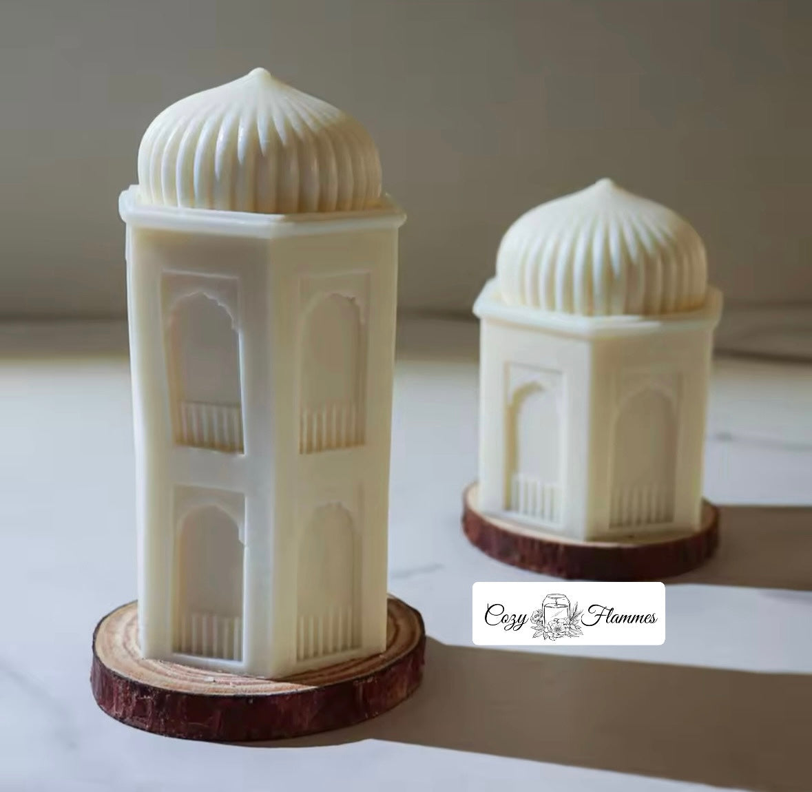 Elevate your home decor with this exquisite Mosque Candle Set, inspired by the stunning architecture of Islamic domes and minarets. Crafted from high-quality wax, these candles feature intricate arch detailing and a ribbed dome top, adding a touch of elegance and cultural charm to any space.