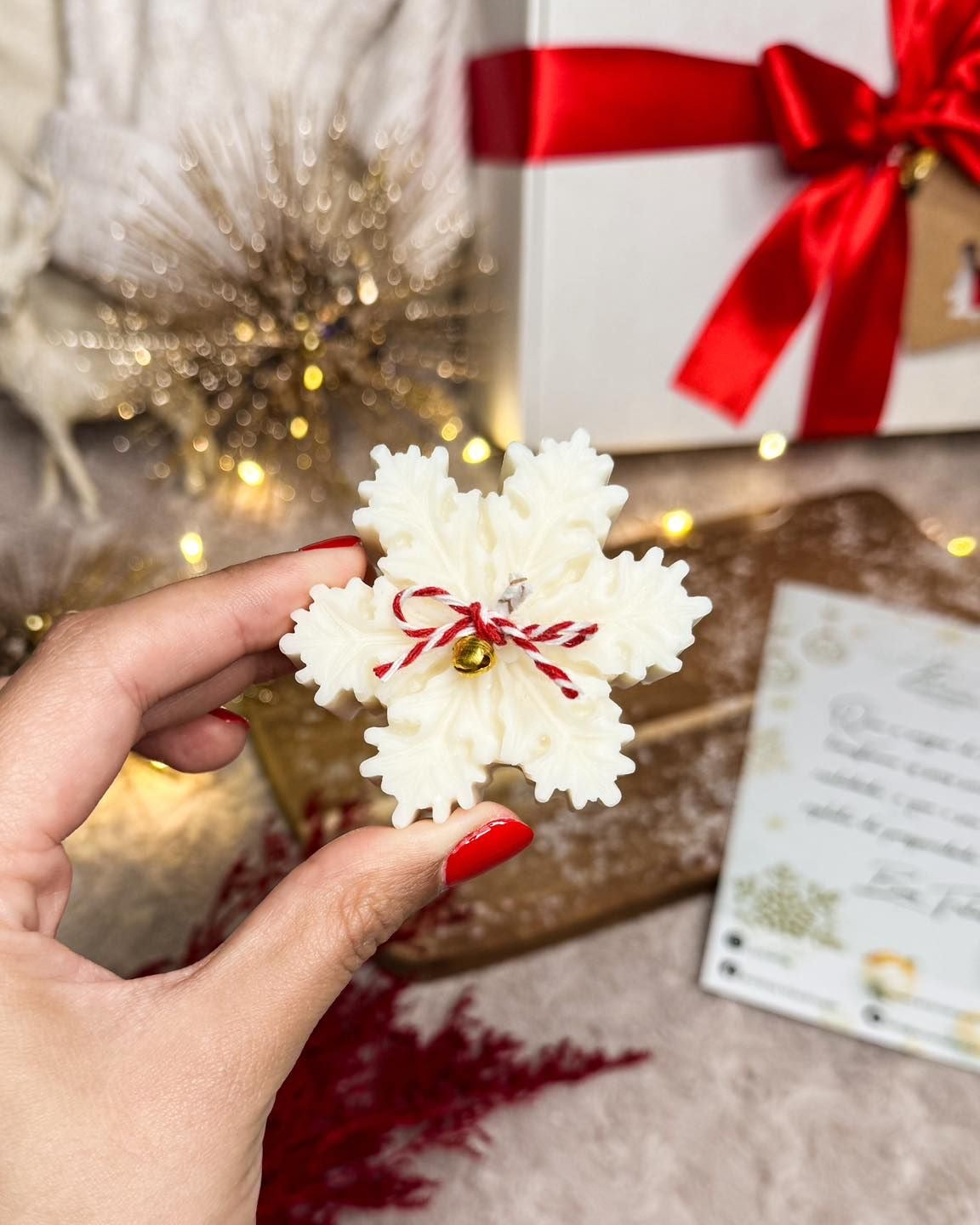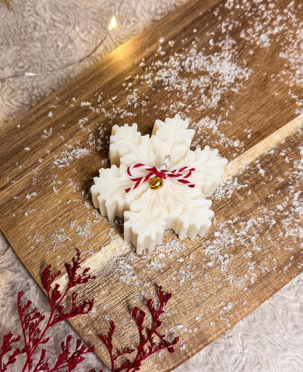 Celebrate the magic of winter with our Crystal Glow Candle, a delicately sculpted piece that captures the beauty of a real snowflake in soft, creamy wax.Each candle features intricate snowflake detailing, giving it a luxurious and elegant look—perfect for holiday décor, gift hampers, or festive table settings. Finished with a charming red-and-white twine bow and a tiny golden bell, it brings a warm, whimsical touch to the season.
